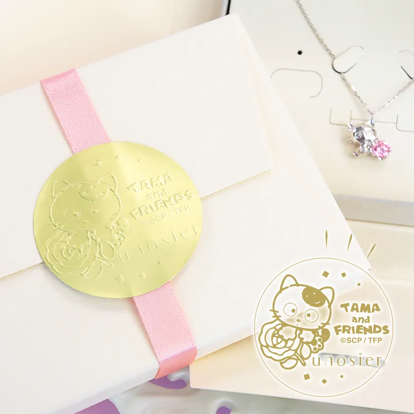 専用パッケージのシールは、「unosier」のテーマでもあるバラのモチーフをタマがぎゅっと抱きしめるオリジナルデザインとなっています。