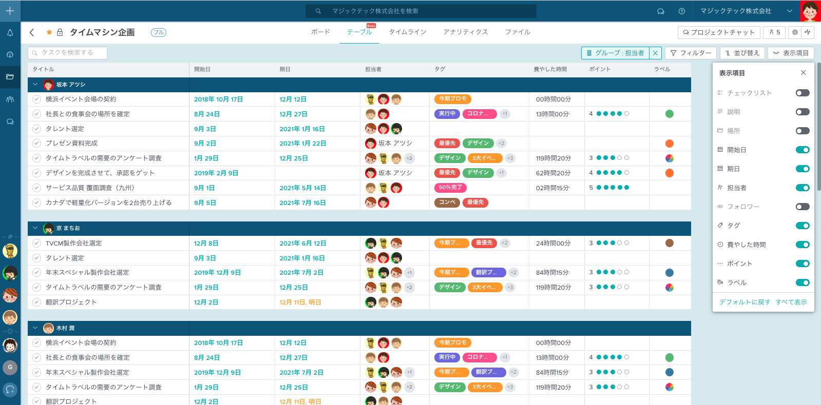 各サブタスクは、タスクカードに設定可能な従来機能「チェックリスト」とは異なり、個別タスク扱いとなるため、「期日設定」、「タスク内コメント」、「タグ」、「タイム計測」を含む、メインタスクで使える機能の全てが利用可能です。