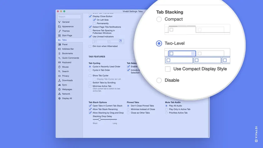 二段型タブスタック機能はデフォルトで有効になっています。Vivaldiの [設定] - [タブ] より、コンパクト表示、二段型表示を切り替えることが可能です。