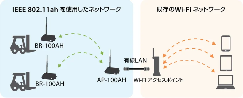 今回リリースしたBR-100AH(US)、AP-100AH(US)の2機種は、有線LANを使用しているネットワーク機器を簡単にIEEE 802.11ah無線LANに対応させるためのワイヤレスブリッジとアクセスポイントで、先述の無線LANモジュール SX-NEWAH(US)を使用しています。専用ドライバのインストール等は必要なく、BR-100AH(US)とAP-100AH(US)をLANケーブルでそれぞれの機器と接続するだけで、有線LANを無線LANに変換することができます。