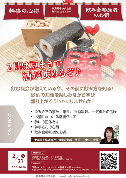 アルコール検知システム、 IT点呼システム、 運行管理システムを開発・販売する東海電子株式会社(本社:静岡県富士市 代表取締役 杉本 哲也)は、 この度、「2月は豆まきで酒が飲めるぞ!飲む機会が増えている今、その前に飲み方を知る! 飲酒基礎講座」ウェビナーを2月21日(水)に無料開催いたします。