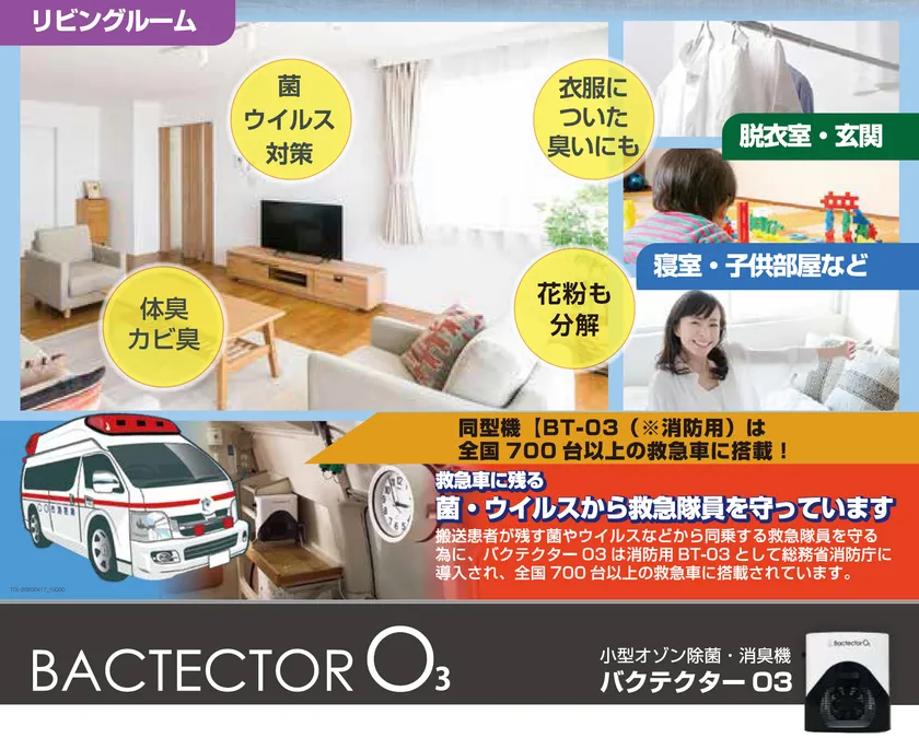 バクテクターO3は消防用BT-03として総務省消防庁に導入され、全国700台以上の救急車に搭載され搬送患者が残す菌やウイルスなどから同乗する救急隊員を守っています。