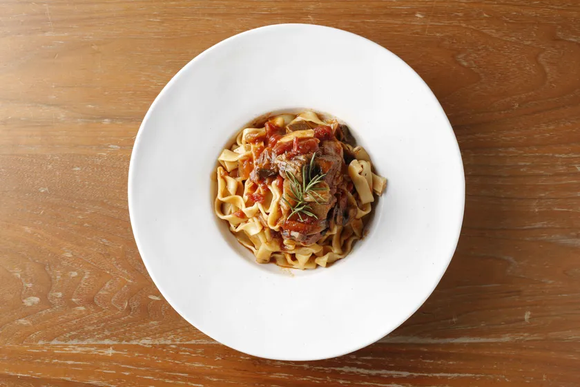 群馬県産和牛すね肉のラグーソースは、すね肉を香味野菜と赤ワイン、ダニエル・マルタン シェフ特製のブレジュオリジナルのフォンドボーでじっくりと煮込んだパスタソースです。
