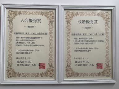 2019年度より開始された所属連盟である「IBJ(日本結婚相談所連盟)」の表彰制度で開始当初より継続的に表彰を受けております。
