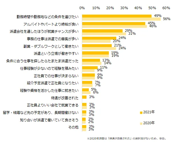 派遣のお仕事を希望する方に、派遣を選ぶ理由を伺ったところ「勤務時間や勤務地などの条件を選びたい」(49%)が最多でした。次いで「アルバイトやパートより時給が良い」(45%)、「派遣会社を通したほうが就業チャンスが多い」(29%)が続きました。2020年の結果と比較したところ、上位3項目の順位に変化はありませんでした。