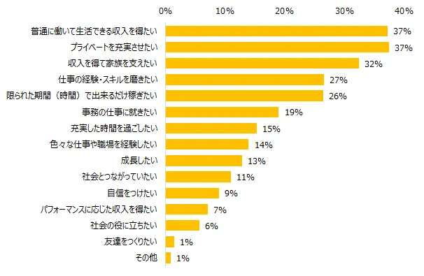 第3位は「収入を得て家族を支えたい」(32%)。「子供の成長につれ学習面での費用がかさむ。可能な限り好きな習い事などをさせてあげたいから 」(35歳女性)、「子供に関係する支出が多いので、家計の一部でも支えたい」(46歳女性)といったコメントが寄せられました。