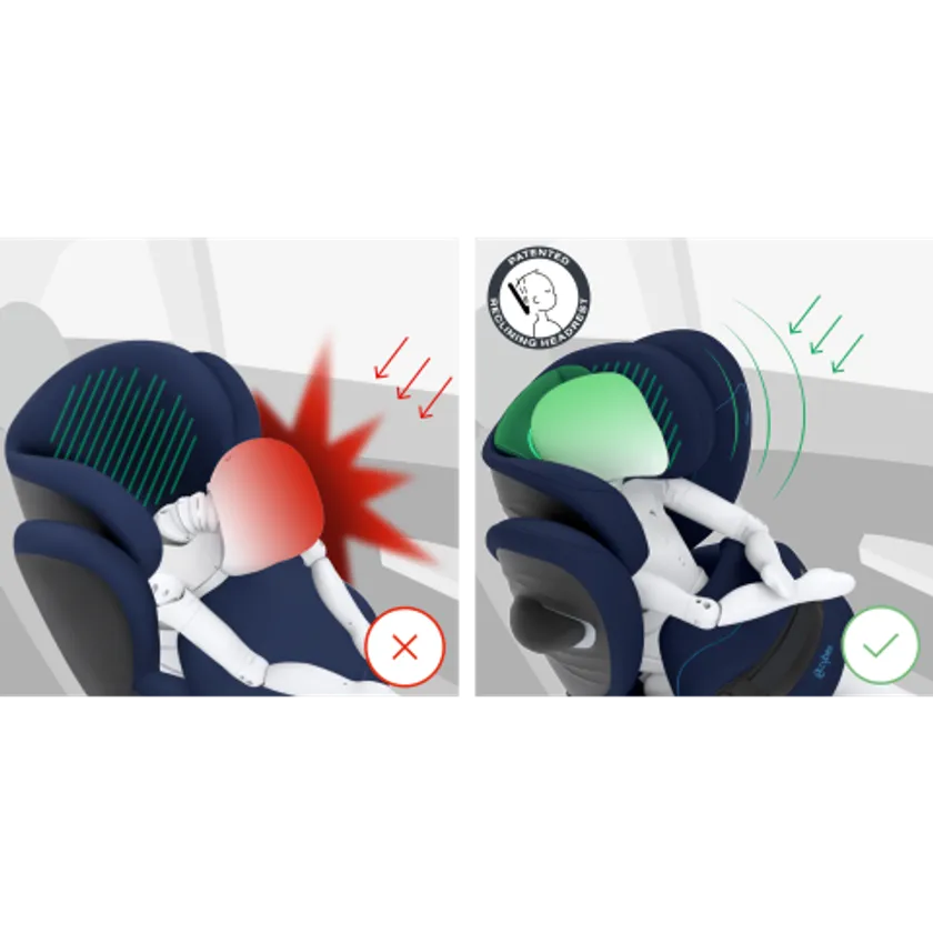 ・サイベックス独自技術のリクライニングヘッドレストが、事故の際怪我をしやすい頭部をヘッドレスト内の安全なエリアに保護。