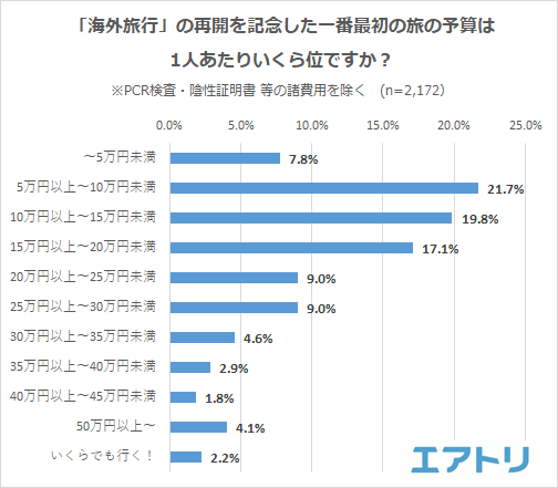 再開後の海外旅行の予算を聞いたところ、最も多かった金額は「5万円以上~10万円未満(21.7%)」、「10万円以上~15万円未満(19.8%)」、「15万円以上~20万円未満(17.1%)」の順となりました。
