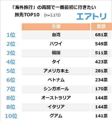 海外旅行の再開で一番最初に行きたい旅先ランキングは、1位「台湾」(681票)、2位「ハワイ」(549票)、3位「韓国」(511票)でした。