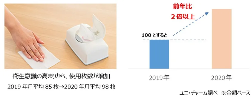 2020年の新型コロナウイルス感染拡大に伴い、ウェットティッシュの市場規模は、2019年と比較して2倍以上拡大。
