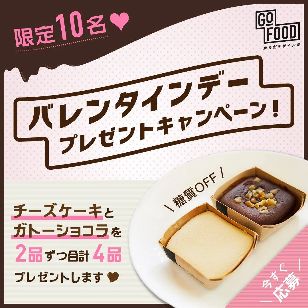 ゴーフード株式会社は、低糖質・高タンパク質の食事を、新鮮なまま冷凍の状態で提供するフードデリバリーサービス「GOFOOD(ゴーフード)」において、「バレンタイン健康応援キャンペーン」を本日2021年1月28日(木)から2月4日(木)までの期間限定で実施いたします。当キャンペーンは、「バレンタインこそ、健康を配慮した美味しいスイーツを」というバレンタインの新コンセプトを提案するもので、当社で開発した「糖質オフガトーショコラ」「糖質オフチーズケーキ」の低糖質スイーツ詰め合わせセットを、抽選で10名様にプレゼントいたします。