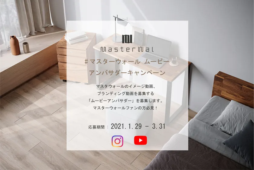 家具ブランド「MASTERWAL(マスターウォール)」( https://www.masterwal.jp/ )を運営するAKASE株式会社(本社:岡山県浅口郡里庄町、代表取締役社長:藤井 幸治)は、2021年1月29日(金)より、マスターウォールアンバサダーキャンペーン2021を開催いたします。アンバサダーキャンペーン2021では、マスターウォールの「公式アンバサダー」として、マスターウォール商品を実際に使っていただく中で、自身のライフスタイルをWEBやSNSを用いて情報発信・活動していただける方を募集します。「ムービーアンバサダー」では、2つの部門でイメージ動画やブランディング動画などの映像作品を幅広く募集いたします。