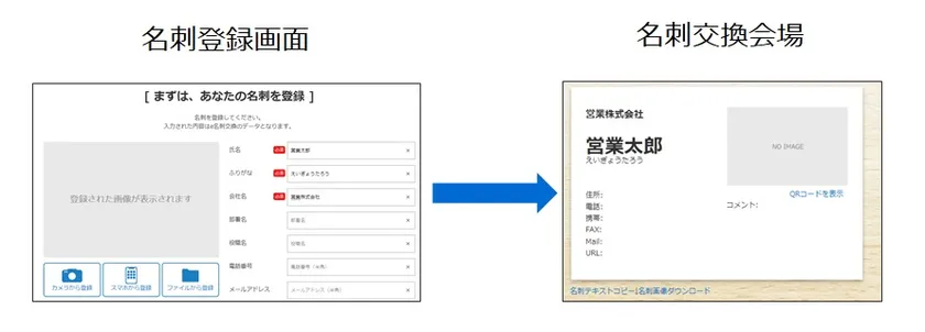 本サービスは、パソコン・スマートフォンから名刺画像を読み込むだけで、商談相手と名刺情報を交換することが可能になります。交換した名刺は商談中も表示可能で、情報を確認しながら商談頂けます。