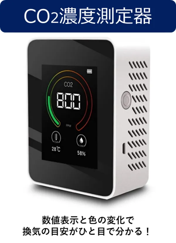 新製品の「CO2濃度測定器」は、室内にある空気中の二酸化炭素濃度を計測し、可視化することで、換気のタイミングを計るのに役立つ感染防止対策製品です。電源を入れると常に二酸化炭素濃度を測定し、数値表示と色の変化で換気の目安をひと目で確認できます。コンパクトサイズでUSB給電となっており、飲食店やオフィス、学校等でスペースを気にせず、すぐにご使用いただけます。また、温度・湿度も同時に計測するので、厚生労働省が推奨している居室の温度および相対湿度を18°C以上かつ40%以上に保つ目安として使用できる製品です。