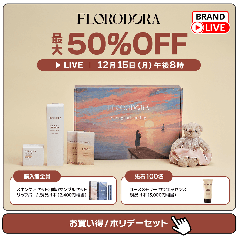 Qoo10ブランドライブでは、フローロドラの人気スキンケアライン「ユースメモリー」シリーズのベストセラー商品とともに、コラボレーションアイテムである「ジョアン・テディベア リミテッド シュシュキーリングセット」が数量限定で販売される予定です。さらに、ブランドの人気フレグランス「FLORODORA シグネチャー オードパルファム」もライブ限定の特別価格で登場し、ご購入者には豪華なノベルティ特典もご用意しております。配信中のご購入者様を対象に特別なプレゼントキャンペーンを実施いたします。