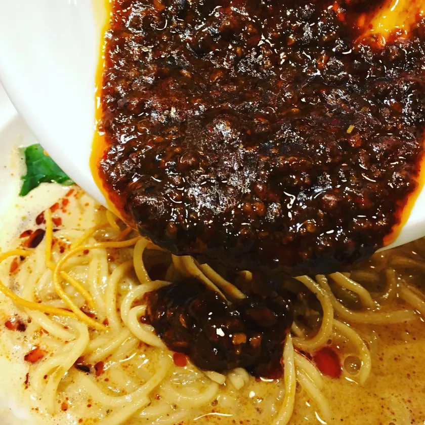 山椒や陳皮、桂皮や八角など、香りの強い素材から抽出した辛味オイルと、“秘密の技法”で真っ黒に焦がした黒オイルをブレンドして作る“黒辣油”。草果、甘草、老姜など特殊素材を入手し辛さより香りを重視した“赤辣油”。この2種類を組み合わせることで香りや辛さに奥行きが出て、スープを飲む手が止まらなくなること必至です。