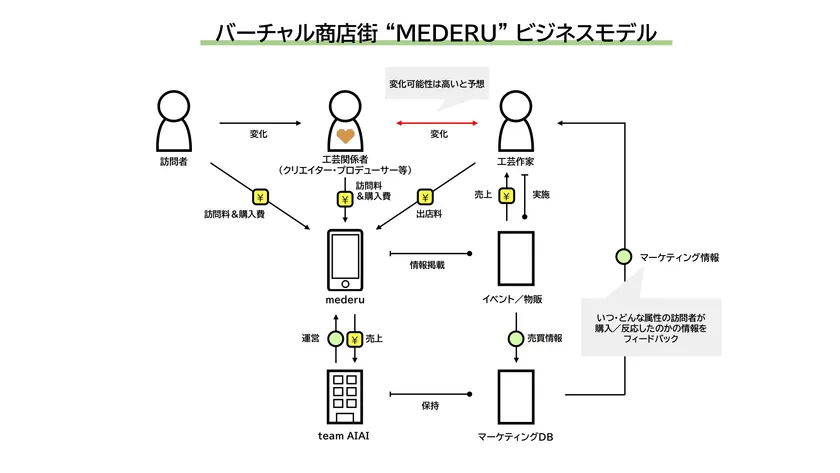 MEDERUはバーチャルな商店街のような作りで、工芸作家/関係者/興味のある一般の方が参加可能です。工芸に興味のある方は工芸関連の対話を楽しむことができ、工芸作家は作品の販売はもちろん、交流を通じてPR方法等の気づきを得ることができます。主な収益源はサロン参加料、また売買発生時の販売マージンです。
