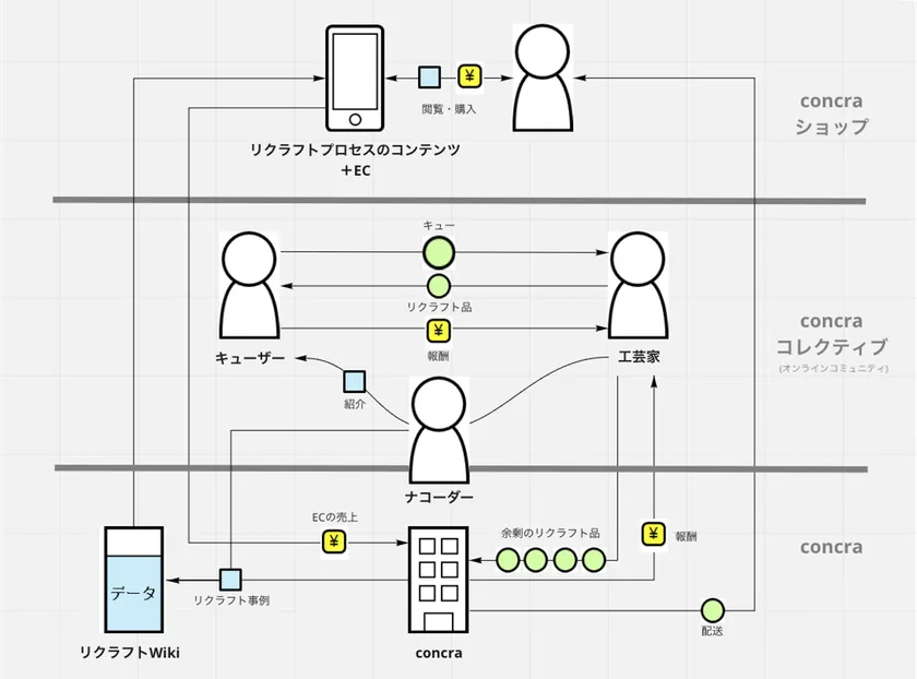 自分の持っているモノをアップサイクルしたいユーザーは、コミュニティ型のオンラインサービスに登録します。ここにはキューザー/ナコーダー/工芸家という3タイプのプレイヤーが参加しています。創作のきっかけとなるユーザーの所有物は「キュー」、それを投げ込むユーザーは「キューザー(Cue+User)」と呼ばれます。様々な工芸の知識を持つ仲立ち役「ナコーダー」が、キューに合った工芸家とキューザーを繋げ、共創のプロセスが始まります。