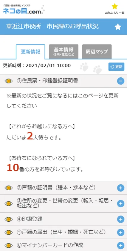 東近江市役所市民課窓口では、窓口での来庁者数増加により、「三密」状況を防ぐための情報サービスとして、リプライス株式会社が提供する、「ネコの目(R)」を採用し、窓口の混雑・空き情報をWebサイト(ネコの目.com(R))上にリアルタイムに配信します。