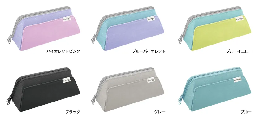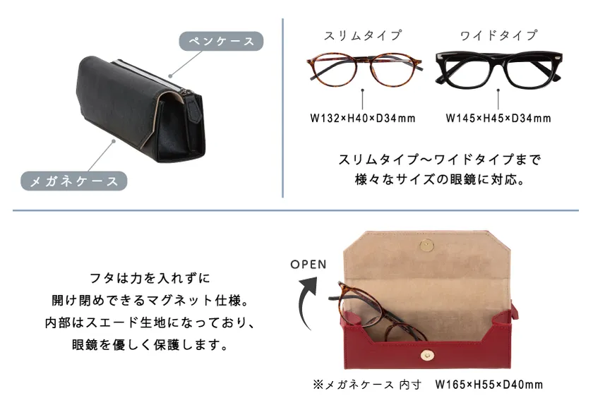 メガネケースとペンケースが一体化したことで、前面にはメガネ、後面には筆記具が入ります。メガネケース部分は、メガネを優しく保護するセミハードタイプ(内生地はスエード調生地)で、マチが硬く、メガネがつぶれにくい仕様です。ペンケース部分は、ペンが4~5本入るスリムタイプ。