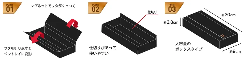 フタを開けて折り返すとマグネットでくっつき、ペントレイに変形!省スペースで、机の上がスッキリ広く使えます。