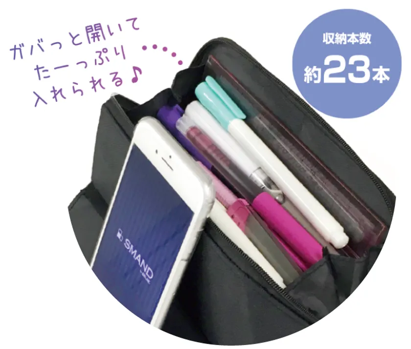 すべり止めがついているので、スマホをタテ・ヨコ・自由な角度に置いたまま、筆記具を取り出せる便利なペンケース。収納本数は約23本。(当社調べ)