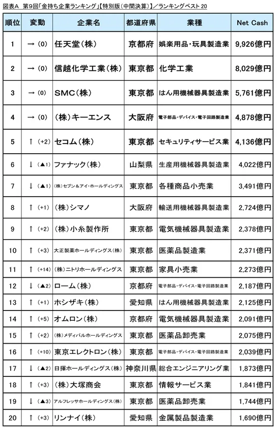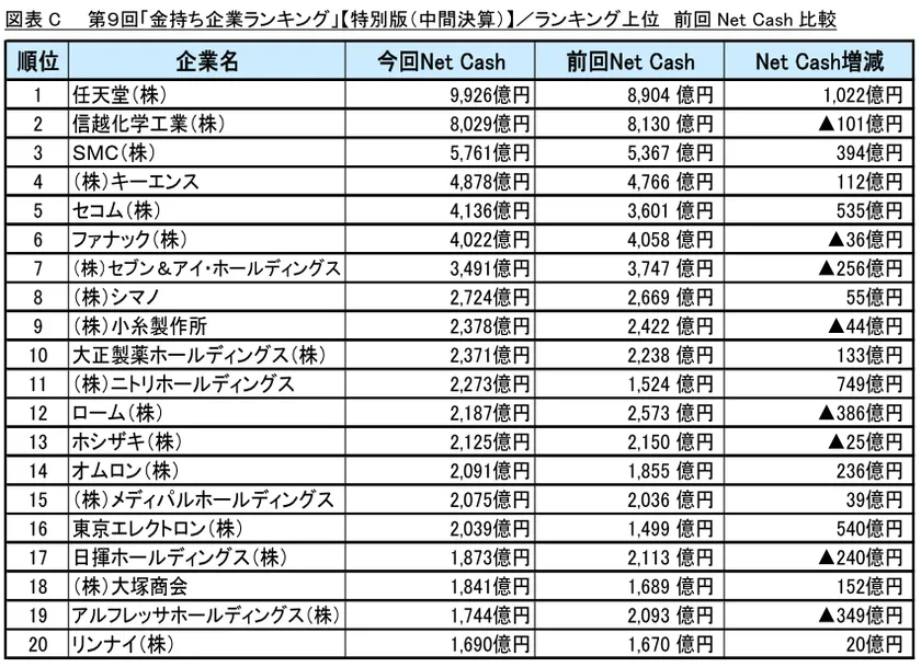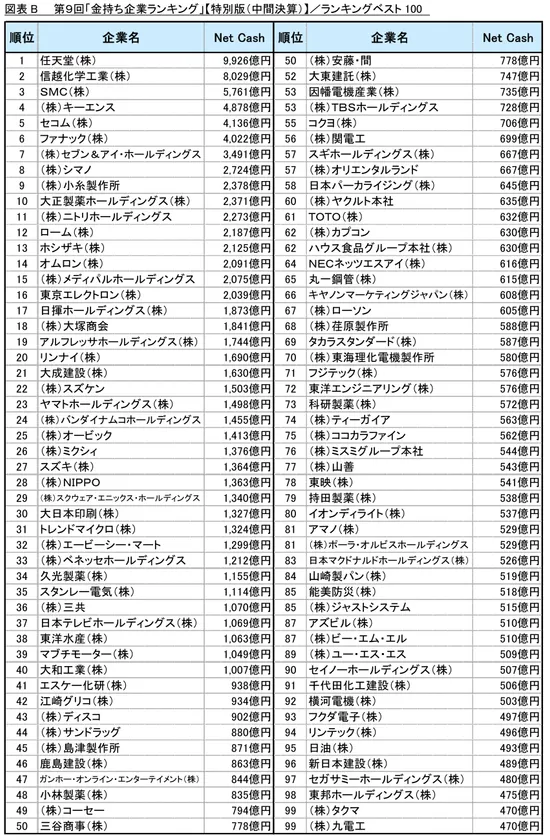 第9回「金持ち企業ランキング」調査【特別版(中間決算)】 上位ランキング常連企業がランク外に!NetCash減少企業目立つ!