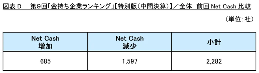 アンケート集計企業全体に対する前回ランキングとのNetCash比較では685社(30.0%)が増加し、1,597社(70.0%)が減少しました。(図表D)