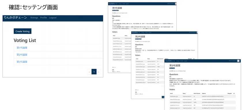 ハイブリッド型の株主総会(参加型)開催時の議決権行使時に利用される目的で開発されており、ブロックチェーン技術により各議案ごとに議決権の賛否を行使できるシステムです。各株主ごとに投票先情報を暗号化し、暗号化したデータをパブリックチェーンに載せ、管理できる株主投票システムで企業側(管理者)も一切改ざんができない仕組みとなっています。