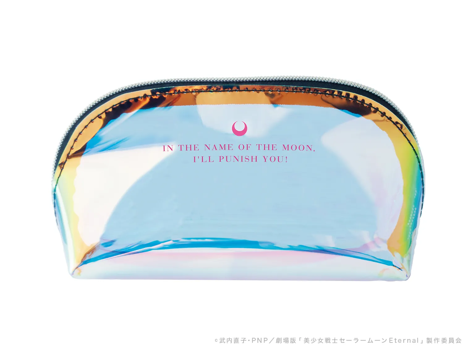 ポーチ表面には月のシルエットとともにスーパーセーラームーンの決め台詞「月にかわっておしおきよ!」の英文「IN THE NAME OF THE MOON, I‘LL PUNISH YOU !!」がデザインされ、裏面には劇場版「美少女戦士セーラームーンEternal」のロゴ入りです。