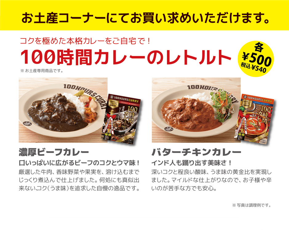 レストランでは「シュリンプフライの100時間カレー」を提供し、プロショップ(お土産コーナー)では100時間カレーB&Rのレトルトカレー「濃厚ビーフカレー」、「バターチキンカレー」の2種類を販売いたします。