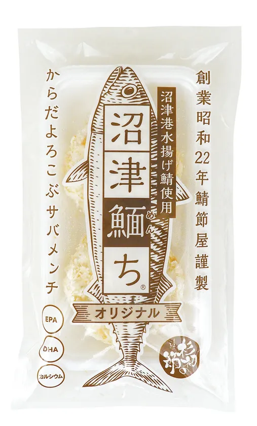商標登録済の「沼津めんち(R)」は、鯖節屋独自の製法を用いており、他では真似できない唯一無二の鯖メンチカツです。沼津港で水揚げした鯖と西伊豆の名産品である西伊豆戸田塩を使い、地産を存分に活かしています。DHA・EPA・カルシウムが豊富な栄養満点の鯖を全国の皆さんに食べていただきたい一心で研究を重ね、食べやすい形と味に仕上げました。外側はサクサク、中はしっとりの食感。「オリジナル」はお子さんにも食べやすい味に、「サヴァリッチ」は粉末状の中骨でカルシウムを強化した栄養機能食品で大人向けの味になっています。