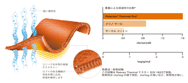 Polartec® (ポーラテック)のThermal Pro®(サーマルプロ)は『熱を逃がさない』高い保温性と『湿度を逃がす』高い通気性、それらに加えて、速乾性と耐久性を合わせ持った、技術的にも視覚的にも優れた断熱生地で