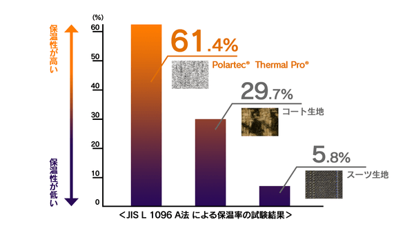 JIS L 1096 A法による発熱体が温度を維持するために使ったエネルギー量から、断熱性を試験を行った結果、61%の保温率という極めて高い保温性の試験結果を出しました。