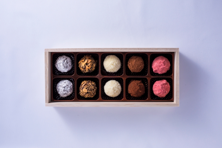 ブランデーや吟醸酒、コーヒー風味の、一粒ずつ丁寧に作られたトリュフショコラの詰め合わせ。すべてにお酒が使用された、大人な雰囲気漂うチョコレートです。
