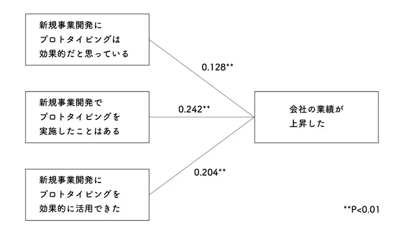 また、業績の変化とプロトタイピングの実施の間の相関関係を明らかにするために分析したところ、有意(**P<0.01)の関係性が示されました。これにより、本リサーチの結果、プロトタイピングの実施が、会社の業績に影響を与えることが明らかになりました。