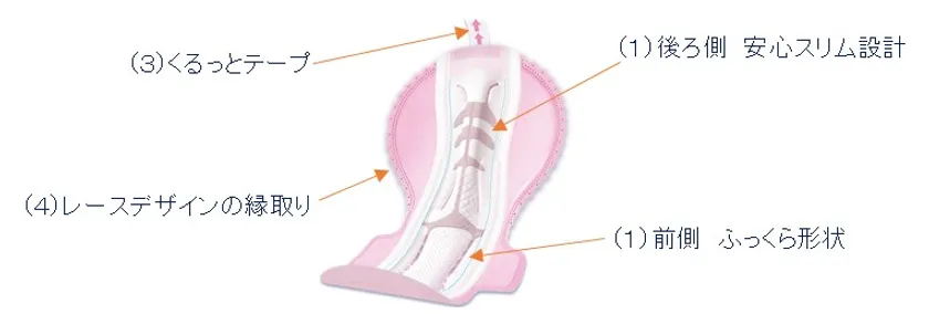 (1)ナプキンの前側はふっくら形状、後ろ側は快適すっきりの“安心スリム設計”でおしりに溶け込むようにフィットし、極上のつけ心地を実現