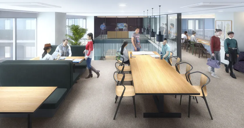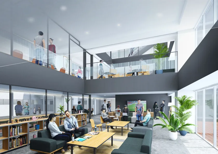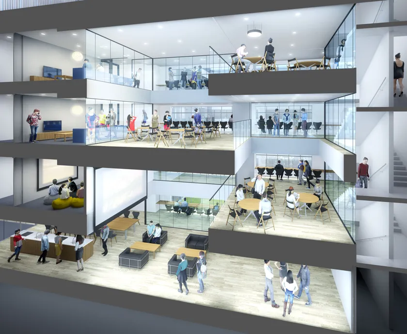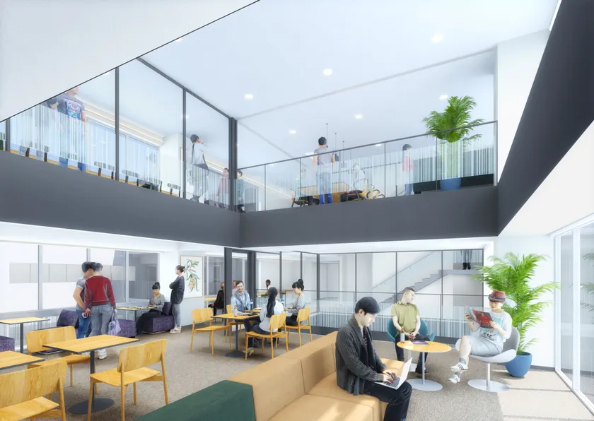 一般的な学生寮ではフロアが複数階にまたがる場合、それぞれのフロアで生活する学生は、その階の空間だけを利用しがちです。本施設では共用スペースに吹き抜け空間を互い違いに設けることにより、そのフロアの上下階を見通すことが可能です。空いているスペースを見つけやすく施設の利用効率が高まるように計画されています。