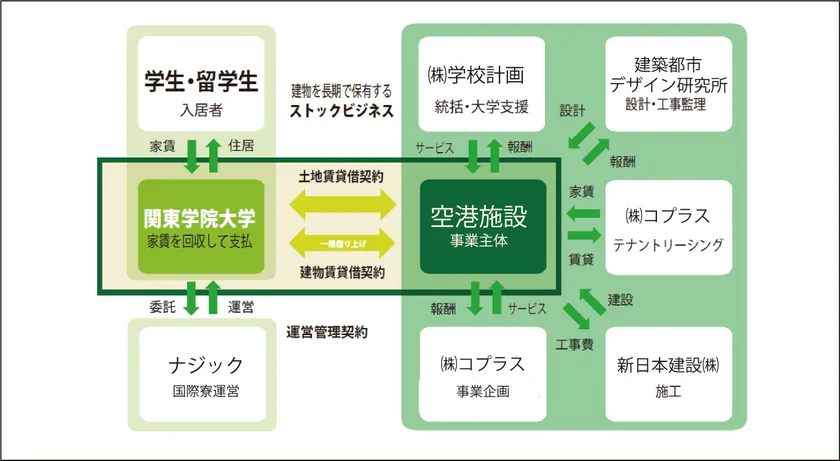 株式会社 学校計画が総合監修を行い、株式会社 コプラスと協働した、次世代型国際学生寮「関東学院大学インターナショナル・レジデンス」が2021年春に開業します。関東学院大学が目指すキャンパスの多様化を推進させ、文化、宗教、言語、思想の異なる多様な人々との交流を通じた学びを深めるために、横浜・金沢八景キャンパスから徒歩2分の至近距離に、海外からの留学生のみならず、日本人学生も共同で生活する国際混住寮を建設します。空港施設 株式会社が学校法人の所有する土地を借地し、建物の建設及び維持管理を行った施設を大学が利用する「事業スキーム」が特徴です。大学と企業との双方にメリットがある価値の高いコラボレーションを実現させることができました。(事業取組形態は後述)