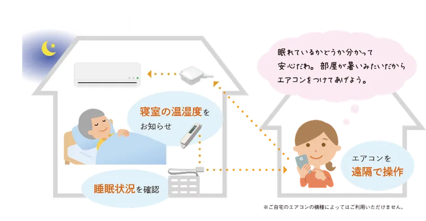 本サービスでは毎日の睡眠に着目し、見守られる側に心理的、肉体的な負担をかけることなく、睡眠深度・時間などの睡眠の質や、入床・離床時刻の推移などの生活リズムをいつでも確認できるため、見守られる側・見守る側、双方に日々の変化に気づきを促すケアサポートを実現します。また、寝室の温度や湿度が予め規定された環境と異なる場合のアラート受信に加え、エアコンを遠隔で操作※5することもできます。なお、提供エリアは1都3県で、今後順次拡大する予定です。