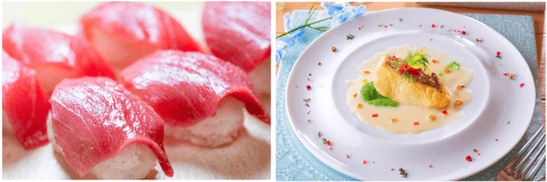左:ライブキッチンから握りたてをご提供。愛媛・九州直送「生本まぐろの握り寿司」。その他にも徳島県産もみじ鯛など全8種のネタをご用意。白身のネタはお醤油はもちろん、讃岐の塩と徳島県産すだちで楽しむのもお薦めです。