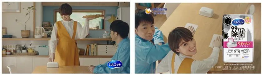 CMの最後には「99.99除菌※1」と声を揃えて仲良くテーブルを除菌します。まるでおふたりのリアルな日常を再現したかの様な、明るく楽しい自然体の演技に、ぜひご注目ください。