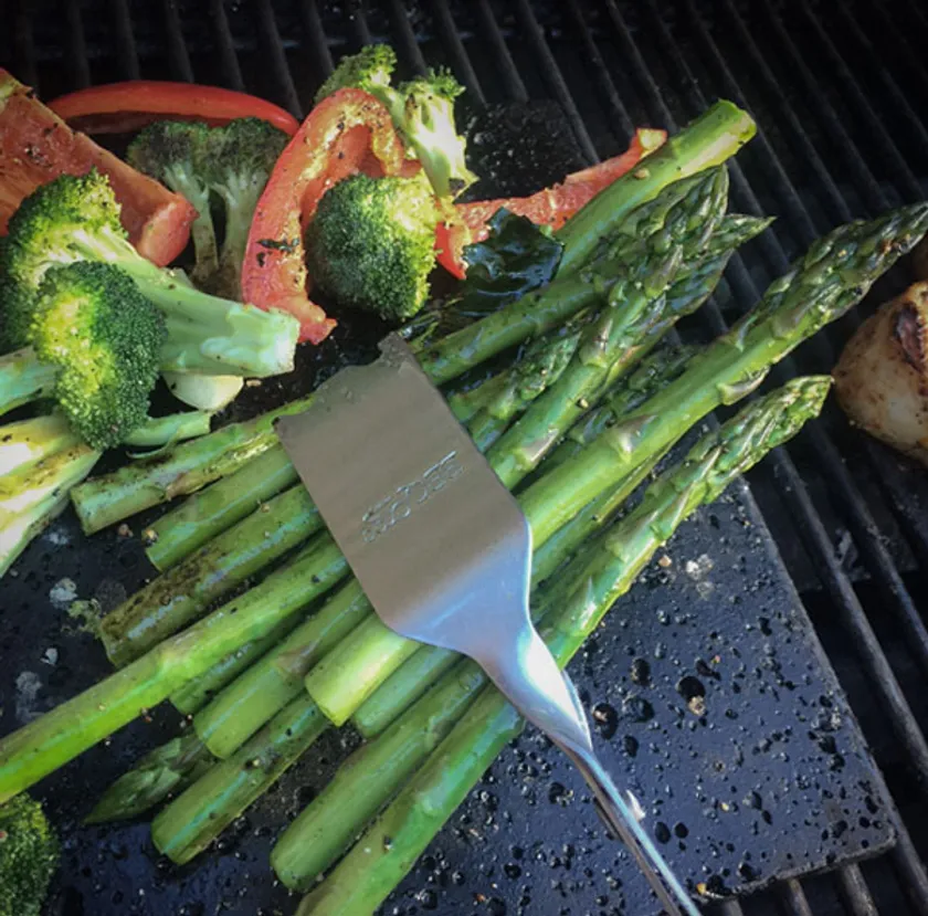 ハンバーグや魚など普通のトングでは崩れやすくて掴みづらい食材も、BBQマルチトングなら平たい幅広設計なので、簡単につかんで返すことができます。また、先端の掴む部分は溝が入っているため、ソーセージやアスパラなどの細い食材をまとめて返すことも可能です。