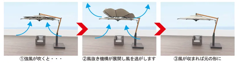 突風時の転倒・破損を防ぐ安全性の高いパラソルでかんたんに日よけ・雨よけが作れます。