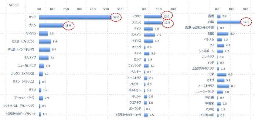 2) 海外では、30代男女を中心に根強い人気の「ハワイ」(54.0%)がトップに。続いて「グアム」(18.0%)、「台湾」(17.1%)と比較的近場のエリアが2位グループを形成。3位グルーには「フランス」(12.5%)、「イタリア」(12.0%)の欧州組が続く。(図3参照)
