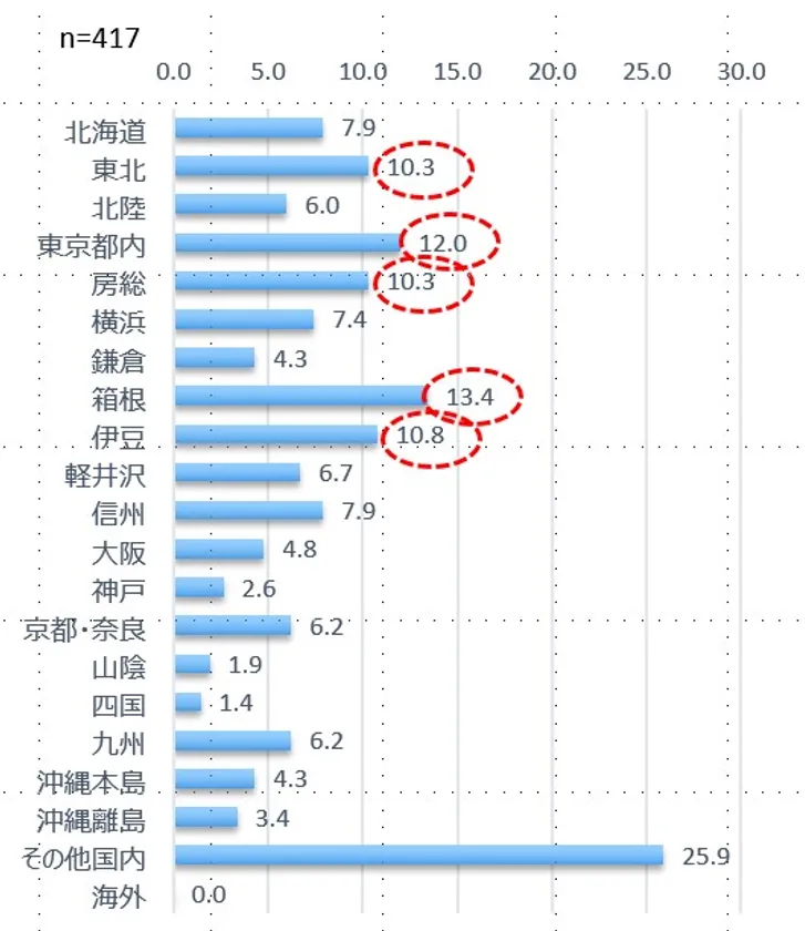 2) 目的地は「箱根」(13.4%)を筆頭に、「都内」(12.0%)、「伊豆」(10.8%)、「房総」(10.3%)、「東北」(10.3%)と、首都圏及びその近郊に集中した。(図5参照)