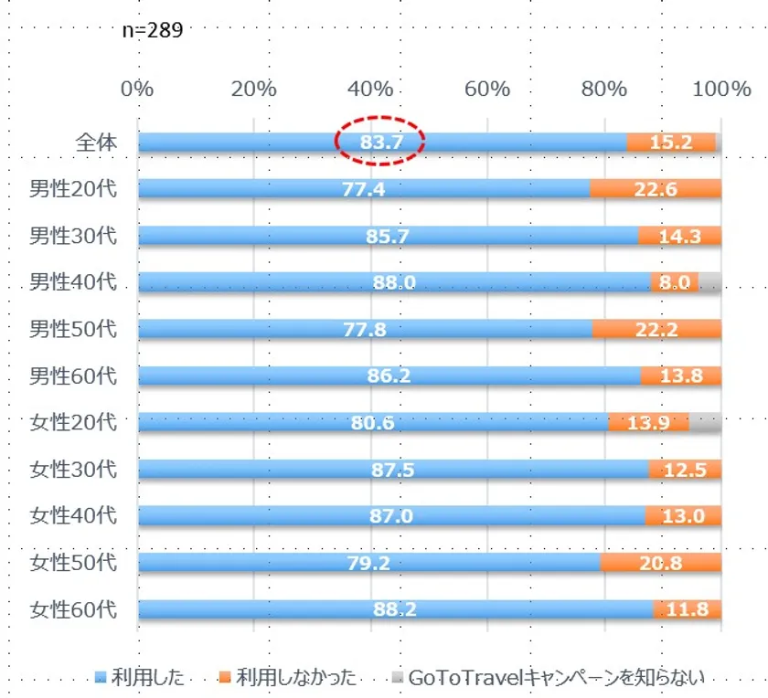 3) 昨年10月以降に「リゾート・旅行」を行ったと回答した人のうち83.7%が「GoToトラベル」を利用したと回答。