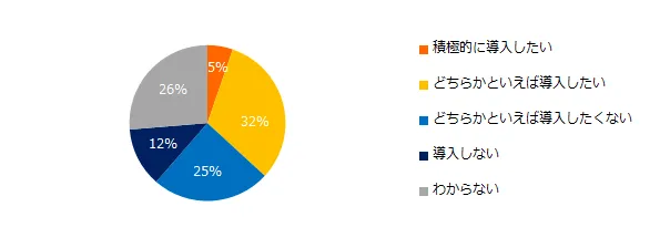 「今後、オンライン商談を導入していきたいですか?」と伺うと、「導入したい」(積極的に導入したい:5%、どちらかといえば導入したい:32%)と、「導入したくない」(どちらかといえば導入したくない:25%、導入しない:12%)はどちらも同率で37%でした。それぞれ理由も紹介します。