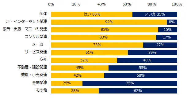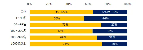 一方、導入率が50%を下回ったのは、「不動産・建設関連」(45%)、「流通・小売関連」(42%)、「金融関連」(25%)でした。企業規模別の結果も、あわせてご報告します。
