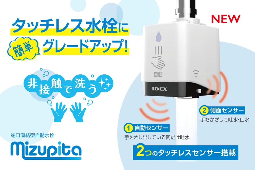 IDEX株式会社(所在地:神奈川県横浜市、代表取締役:安田 孝夫)は、昨年10月発売の、蛇口に取付けるだけで簡単に自動水栓になる蛇口直結型自動水栓水ぴた(型番:MP-320WS)に、専用器具を取付けることで、学校や工場などに多くある水栓蛇口に対応した「水ぴた本体セット品」を2021年2月中旬より順次出荷致します。